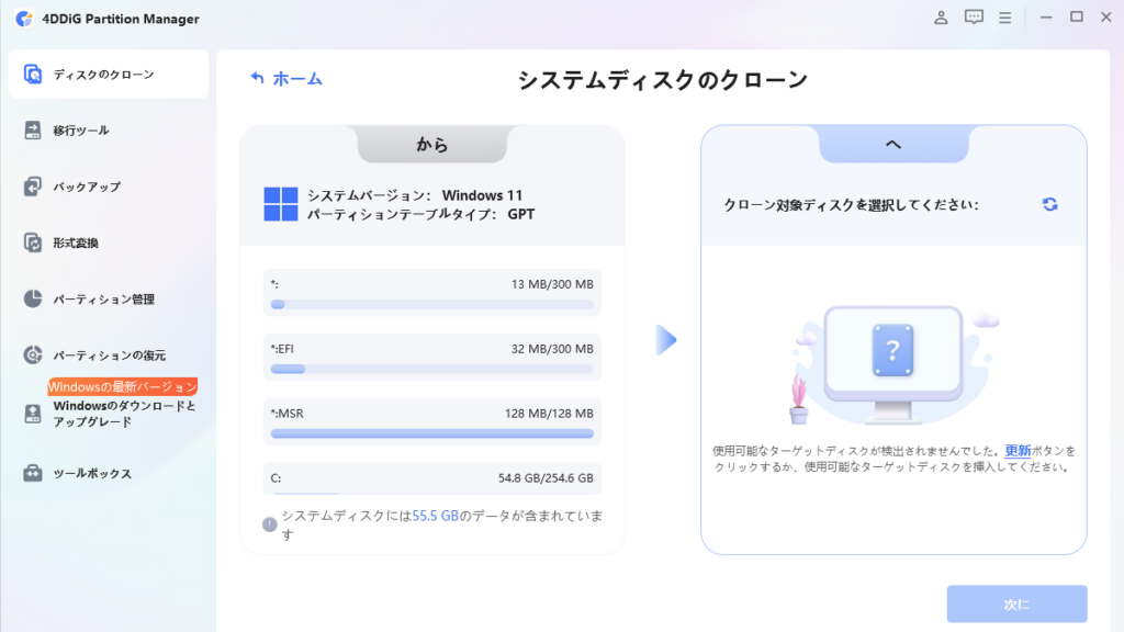 ここからは、私が4DDiG Partition Managerを使ってみたときのSSDクローン・OS移行の流れをざっくり紹介します。環境によって違いはありますが、イメージは掴めると思います。