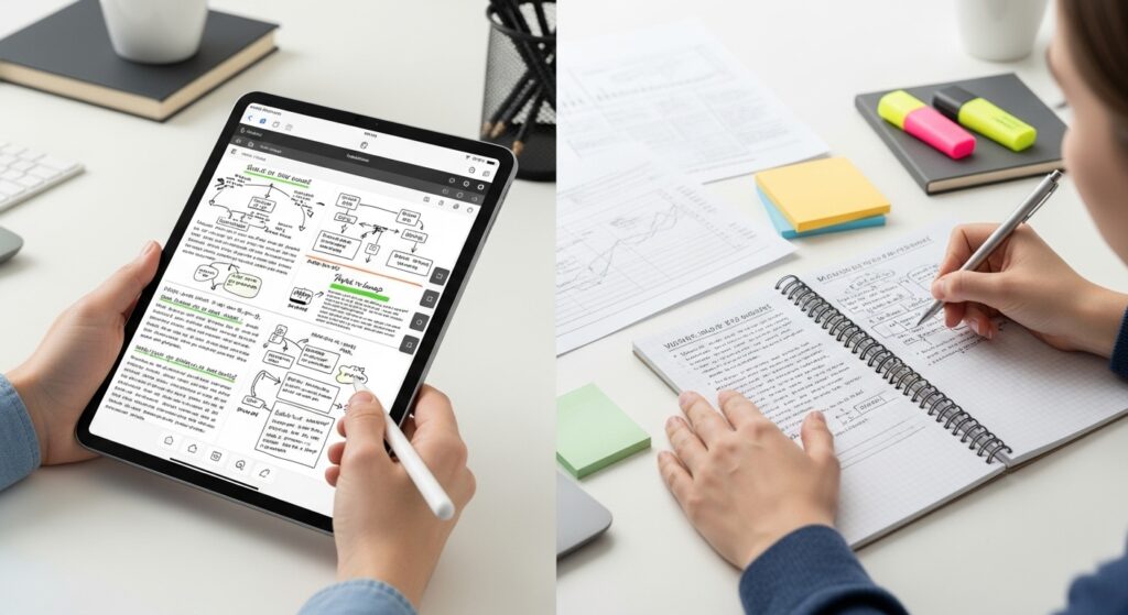 一方、iPadの強みは、前述の通り、情報の「管理」と「再活用」にあります。講義の記録、議事録、読書メモなど、後から検索したり、編集・共有したりする可能性のある情報は、デジタルで一元管理するのが圧倒的に効率的です。