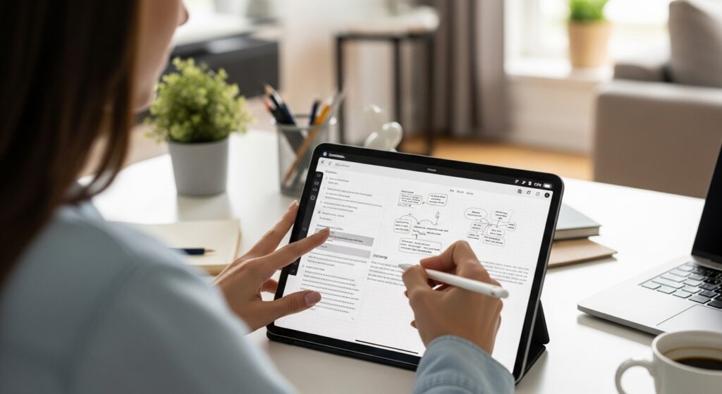 一方、iPadの強みは、前述の通り、情報の「管理」と「再活用」にあります。講義の記録、議事録、読書メモなど、後から検索したり、編集・共有したりする可能性のある情報は、デジタルで一元管理するのが圧倒的に効率的です。