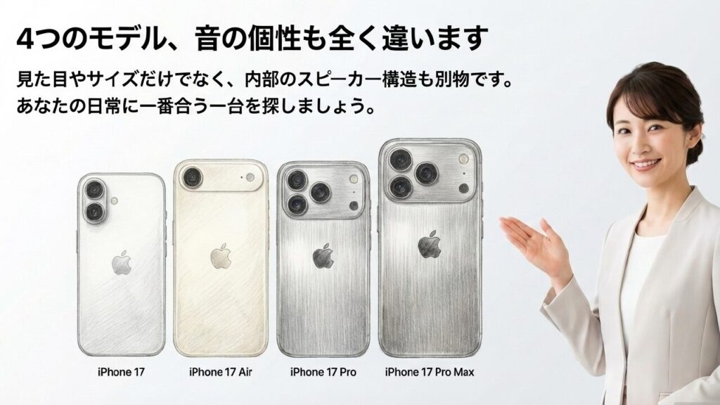ここで、iPhone 17シリーズのスピーカー構成を整理しました。Airが「モノラル」である点は最大の注意ポイントです。