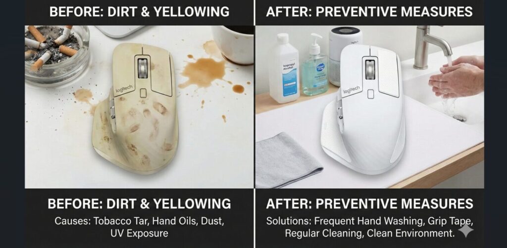 ここに、人間の手から常に供給される皮脂や汗、ハンドクリーム成分が加わると話はさらにややこしくなります。皮脂やファンデーションの油分は、マウス表面のコーティングやラバー部分にじわっと浸透し、時間をかけて黄ばみやすい層を作ってしまうんですね。特に白ゲーミングマウス汚れは、単なる「汚れを拭き取る」だけでは追いつかないケースが多いです。