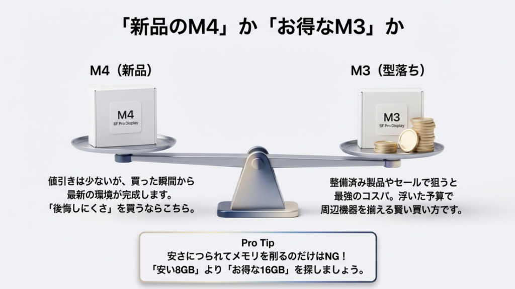 あなたが欲しいのは「最安値」か「後悔しにくさ」か。前者ならM3の値崩れタイミング、後者ならM4の標準構成(メモリや外部ディスプレイ)まで見て決めるのがラクです。