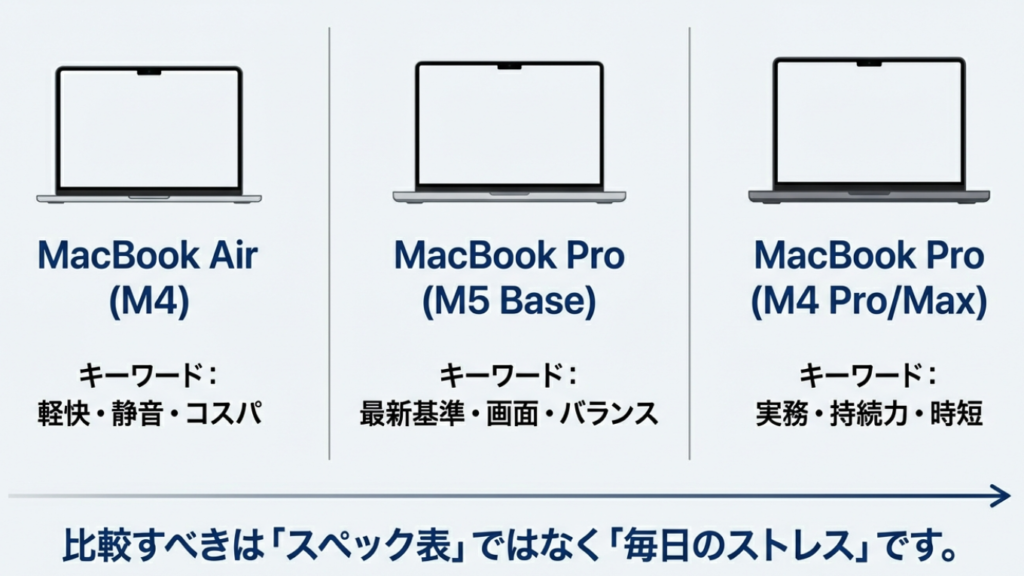 最後に、MacBook ProとAirの違いを整理します。現在のラインナップは「M5ベースPro」と「M4 Pro/Max」が混在しているため、以下の表で整理してください。