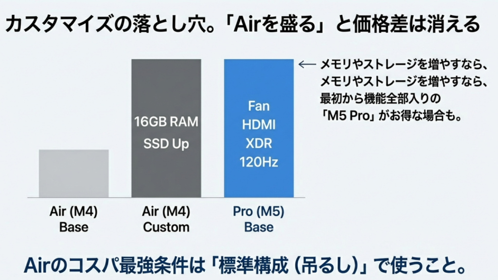 ここで「それなら、少し重くても機能全部入りのProの方がお得じゃない?」という逆転が起きがちです。逆に、Airを吊るし(標準構成)で安く買って、データはクラウドや外付けSSDで逃げると、Airのコスパは最強になります。