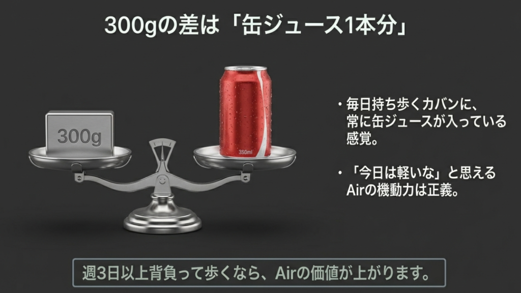 持ち歩きが多い人は、ここで悩みますよね。AirとPro(14インチ)の重量差は、モデルにもよりますがおおよそ300g〜400g程度。これは「350mlの缶ジュース1本」を常にカバンに余計に入れている感覚に近いです。