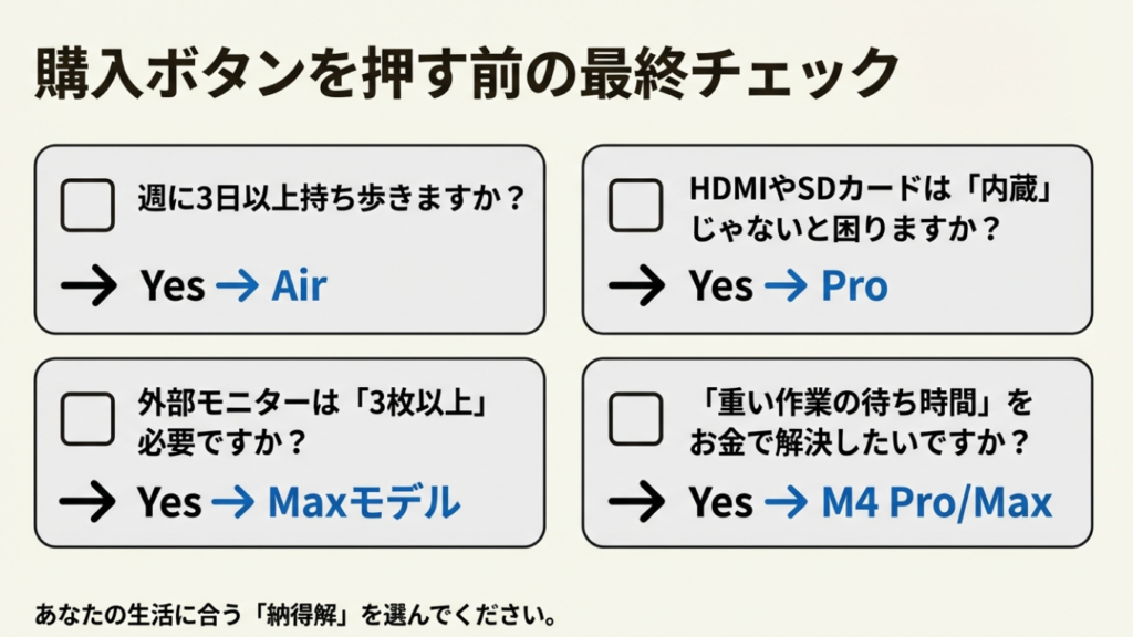 - 今すぐ「重い作業の時短」が必要か?(必要ならM4 Pro/Maxが強い)
