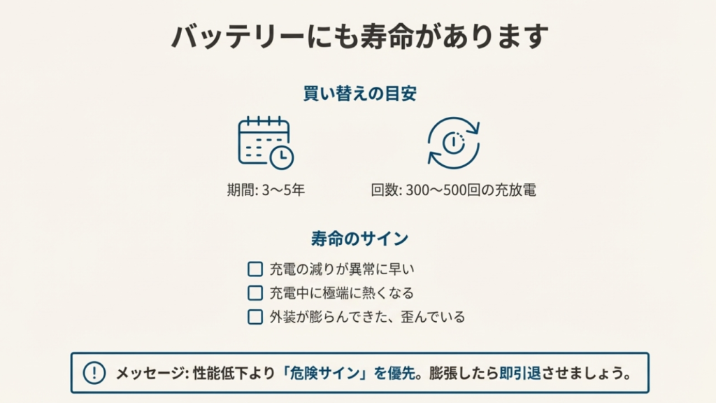 寿命の判断は「安全が最優先」です。少しでも不安があるなら買い替えも選択肢。特に膨張が出たら、私は即引退させます。
