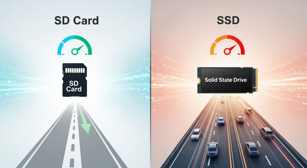 SDカードとSSDの違いって、結局なにが決定的に違うの?速度?寿命?それとも用途?ここ、気になりますよね。